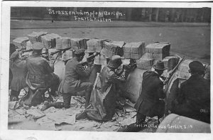 Sometimes when researching for stories, you find gems. While doing background reading for my story about Rosa Luxemburg, I’d read that during the Sparticist Uprising, the workers took over the publishing district of Berlin. Then I found this photograph. They are using newspapers and paper as barricades.
