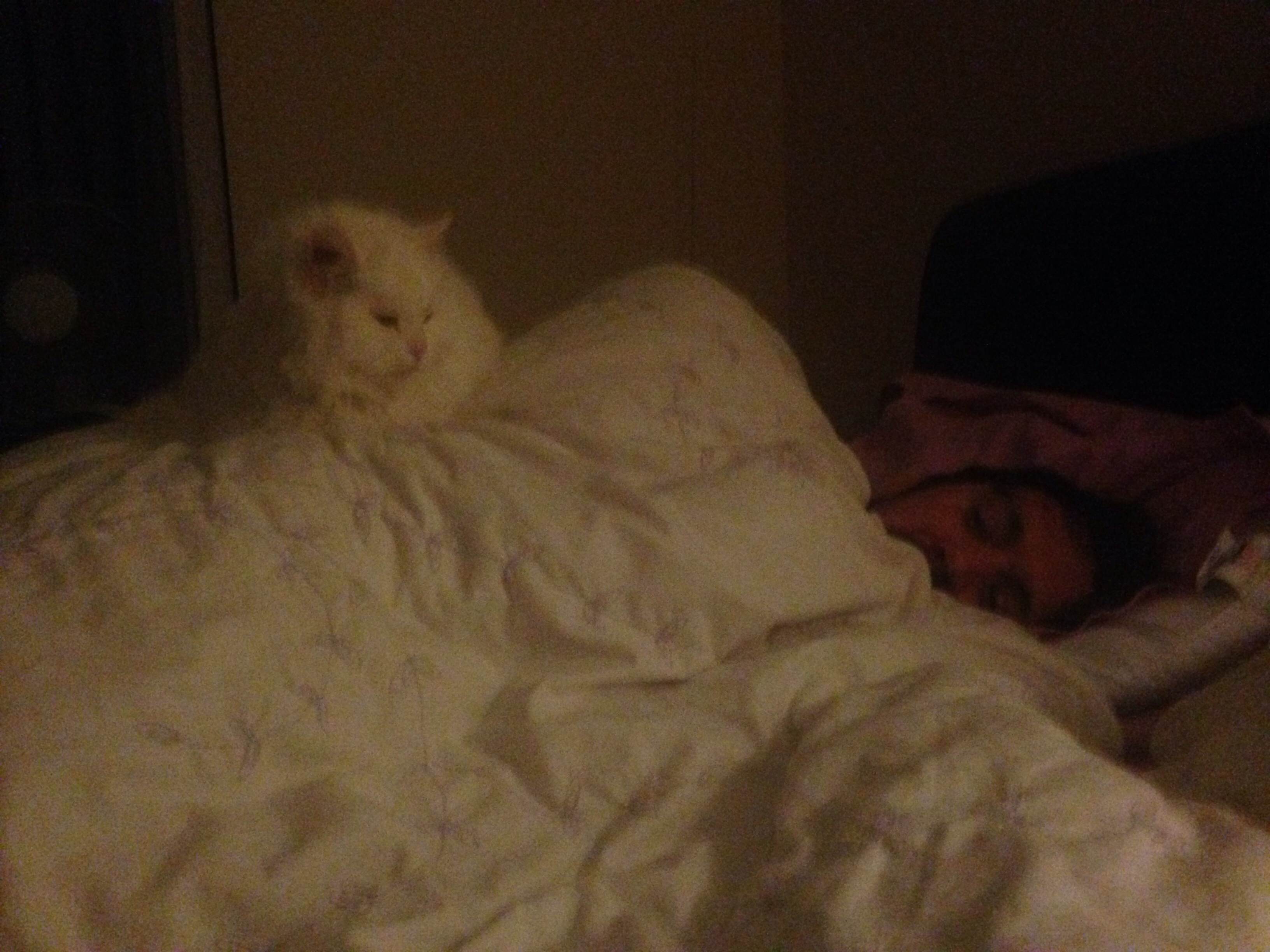 She disappeared on Tuesday night. We’d only moved to our new flat six months ago, and it’s taken her a while to go outside. She seemed to be getting back to her old self after two house moves in the space of a year. Before that, we lived in Chorlton for years, and she was pretty confident about Going Outside. She is a nervous cat, jumpy, and will dart away when you walk past her. She was a stray, found years ago by a neighbour of my parents in Eccles. She’d been living under his shed. She was emaciated when he found her. She’d got her front leg stuck in a cruel pink and diamante studded collar, and it had bitten into the skin under her arm. When she was found, the word was septic and smelt awful. The neighbour came over and told us about the thin whit cat he’d found, so my dad and I took her to the RSPCA. They couldn’t track her owner, and the rest is history. I’ve no idea about her early life, but she wasn’t socialised well; she will always be fearful, but she is also a lovely, cuddly and gentle cat. She loves a duvet more than anything. She also loves lying on books.