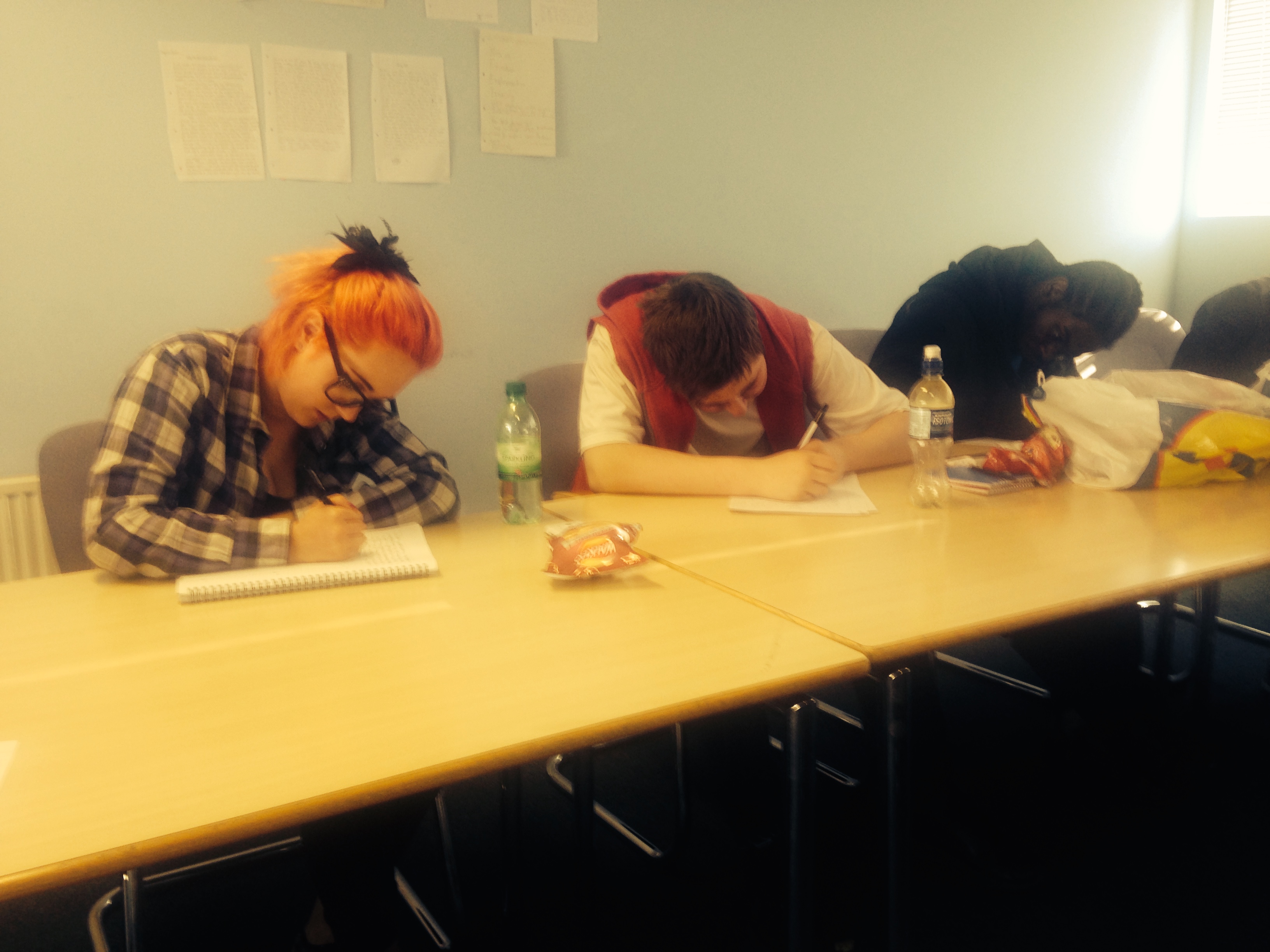Before the course, I was nervous about working with teenagers. I was worried my approach would just be too academic and boring. But these teenagers are fantastic. They have thrown themselves into writing and have worked hard to develop their poems, and to attend the workshops. They are very very excited about being published. Shay and Neil from Family Action took part in the writing exercises too. (see a photo of them below).